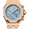 The 34 mm stainless steel selfwinding model is embellished by a “Bleu Nuit, Nuage 50” “Grande Tapisserie” dial encircled by a diamond-set bezel. The piece also features the latest Royal Oak design evolution. Stainless steel case, bezel set with brilliant-cut diamonds, glareproofed sapphire crystal and caseback. “Bleu nuit nuage 50” dial with “Grande Tapisserie” pattern, white gold applied hour-markers and Royal Oak hands with luminescent coating. Stainless steel bracelet with AP folding clasp.