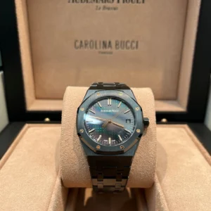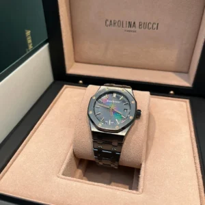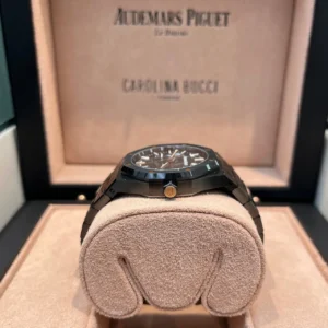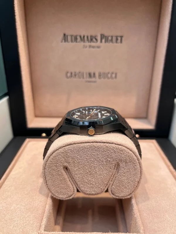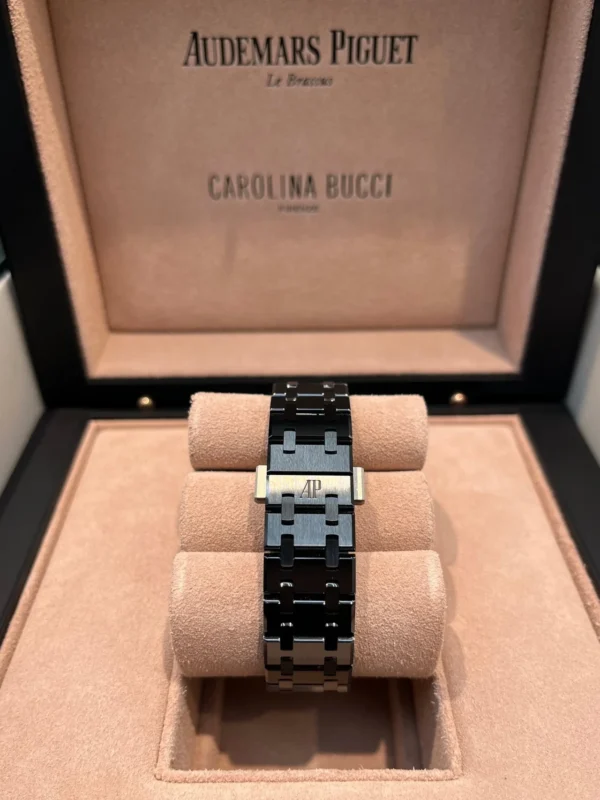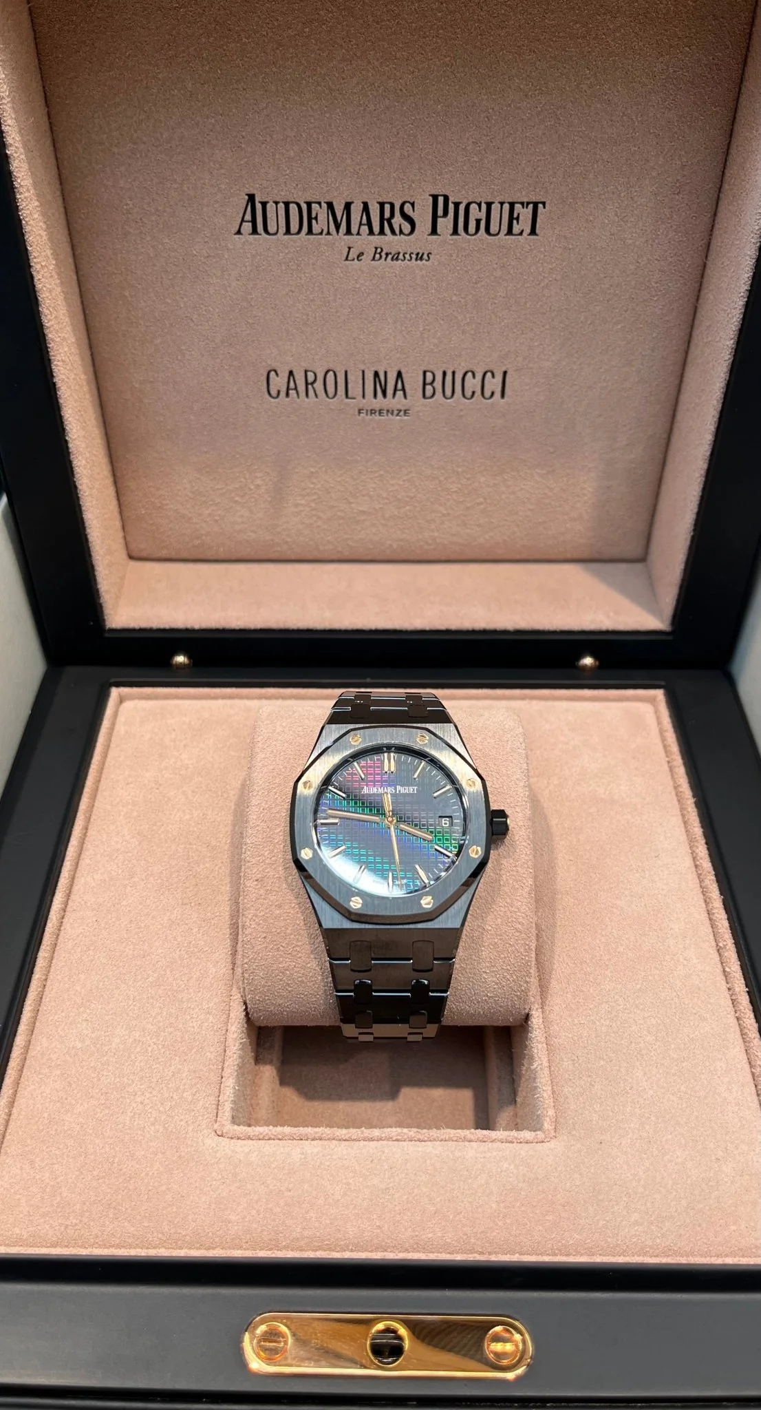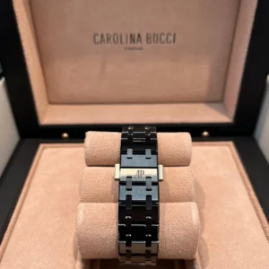 This 34 mm Royal Oak Selfwinding limited edition in black ceramic is the fruit of the Manufacture’s latest collaboration with Carolina Bucci. For the occasion, the jewellery designer has created a dial endowed with a unique multi-coloured mirror effect paying tribute to the iconic Tapisserie design. Black ceramic case, glareproofed sapphire crystal and titanium sapphire caseback. Rainbow-coloured sapphire dial with polished mirror effect showcasing the Tapisserie geometry, pink gold Royal Oak hour-markers and hands. Black ceramic bracelet with AP folding clasp.