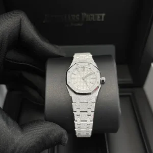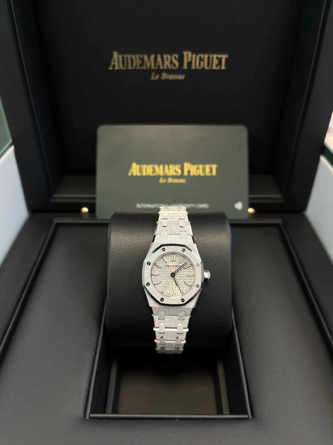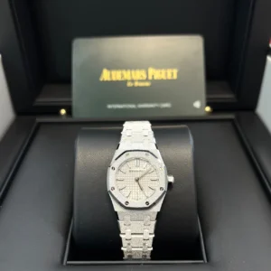 White gold-toned dial with “Petite Tapisserie” pattern, white gold applied hour-markers and Royal Oak hands with luminescent coating.