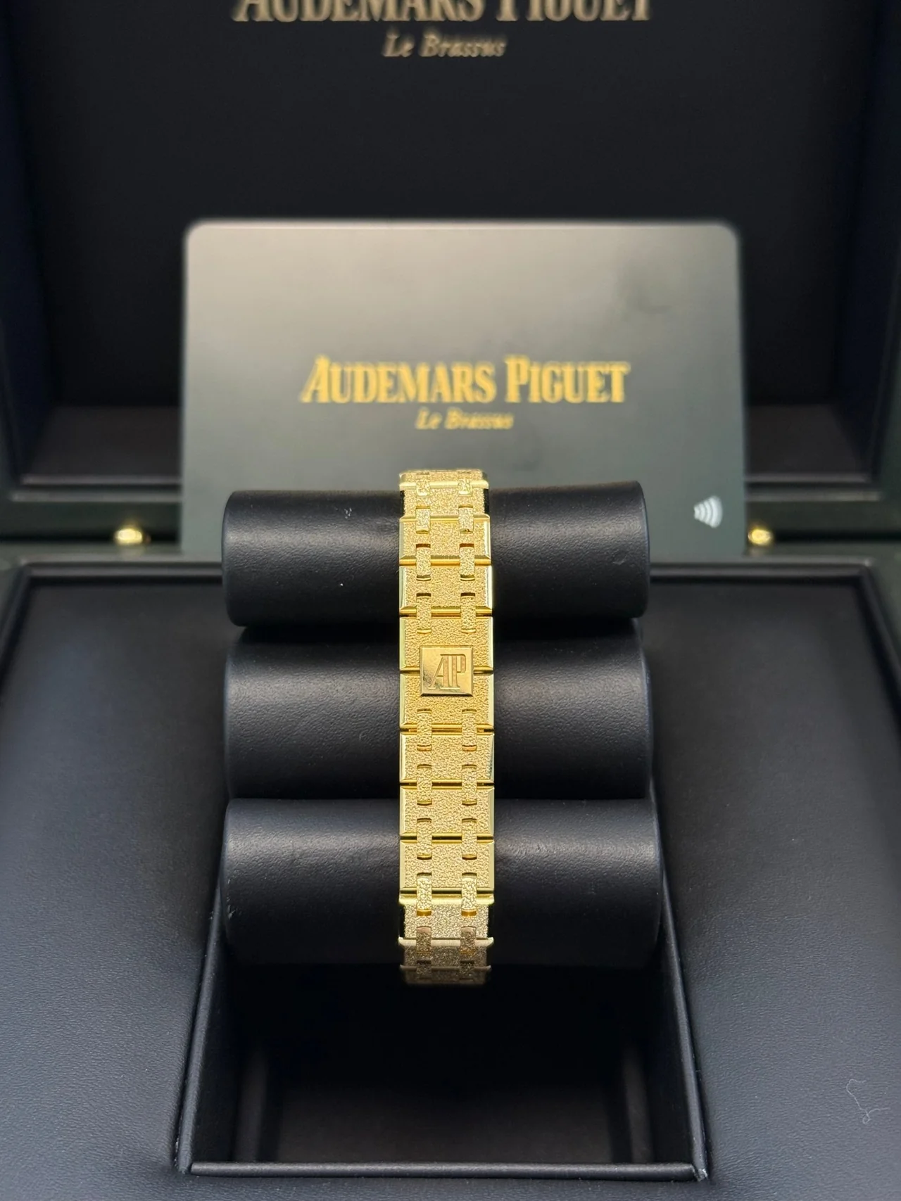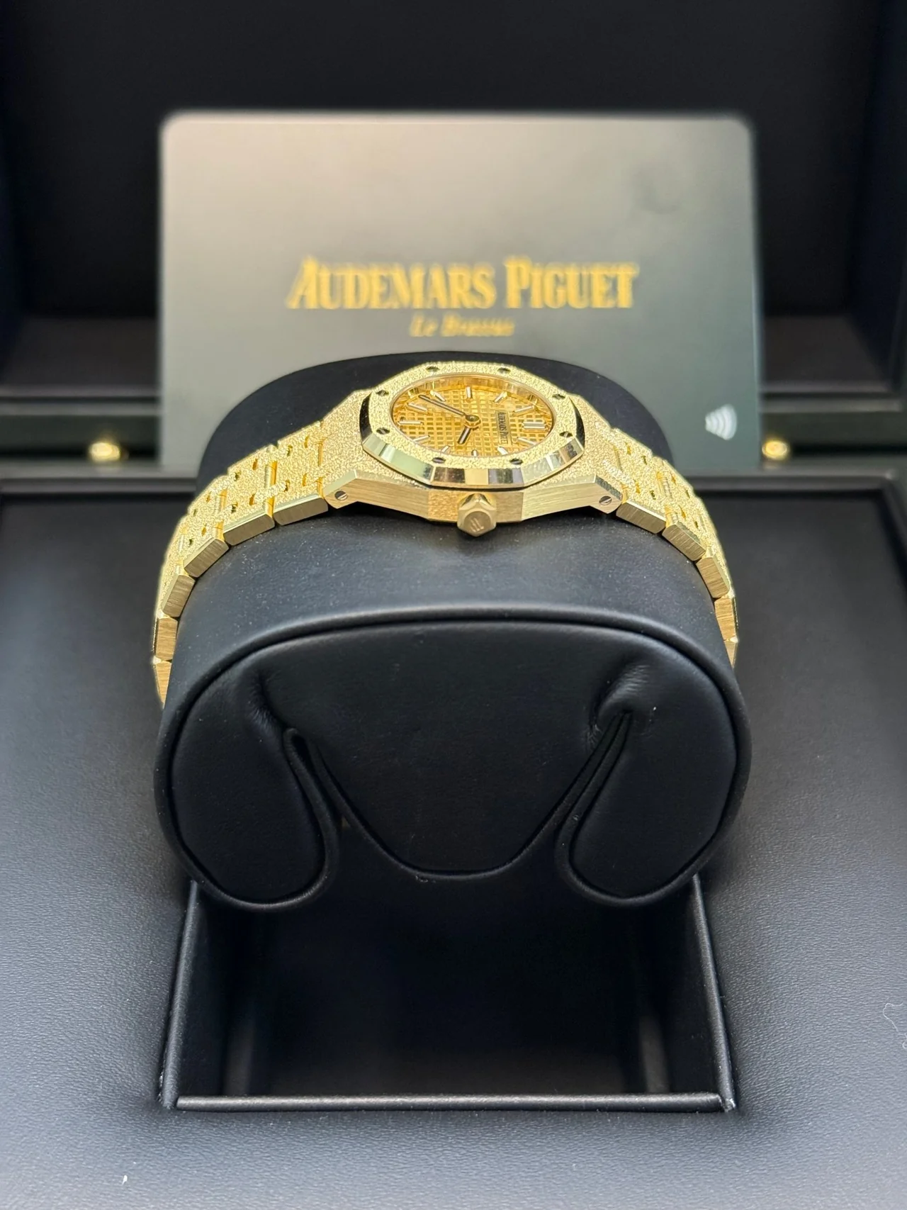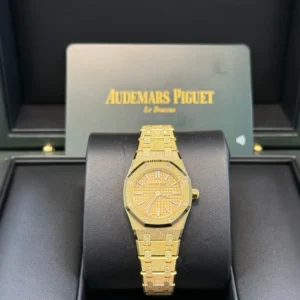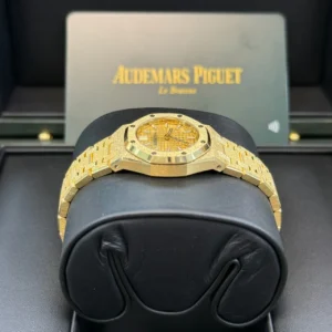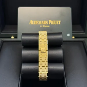 Yellow gold-toned dial with “Petite Tapisserie” pattern, yellow gold applied hour-markers and Royal Oak hands with luminescent coating.