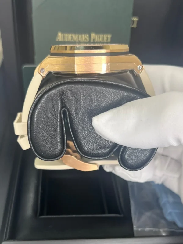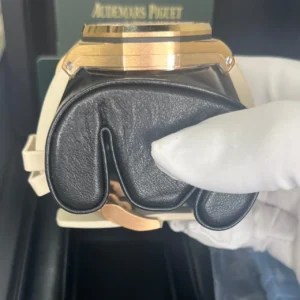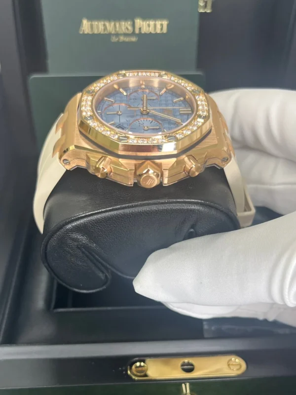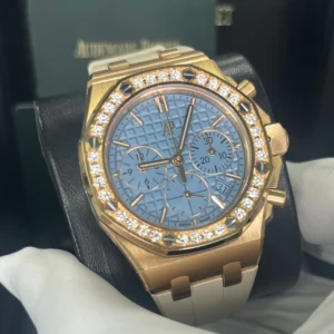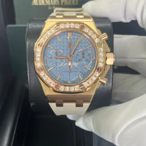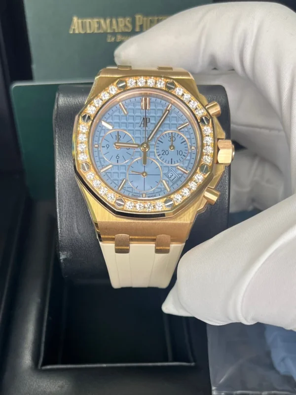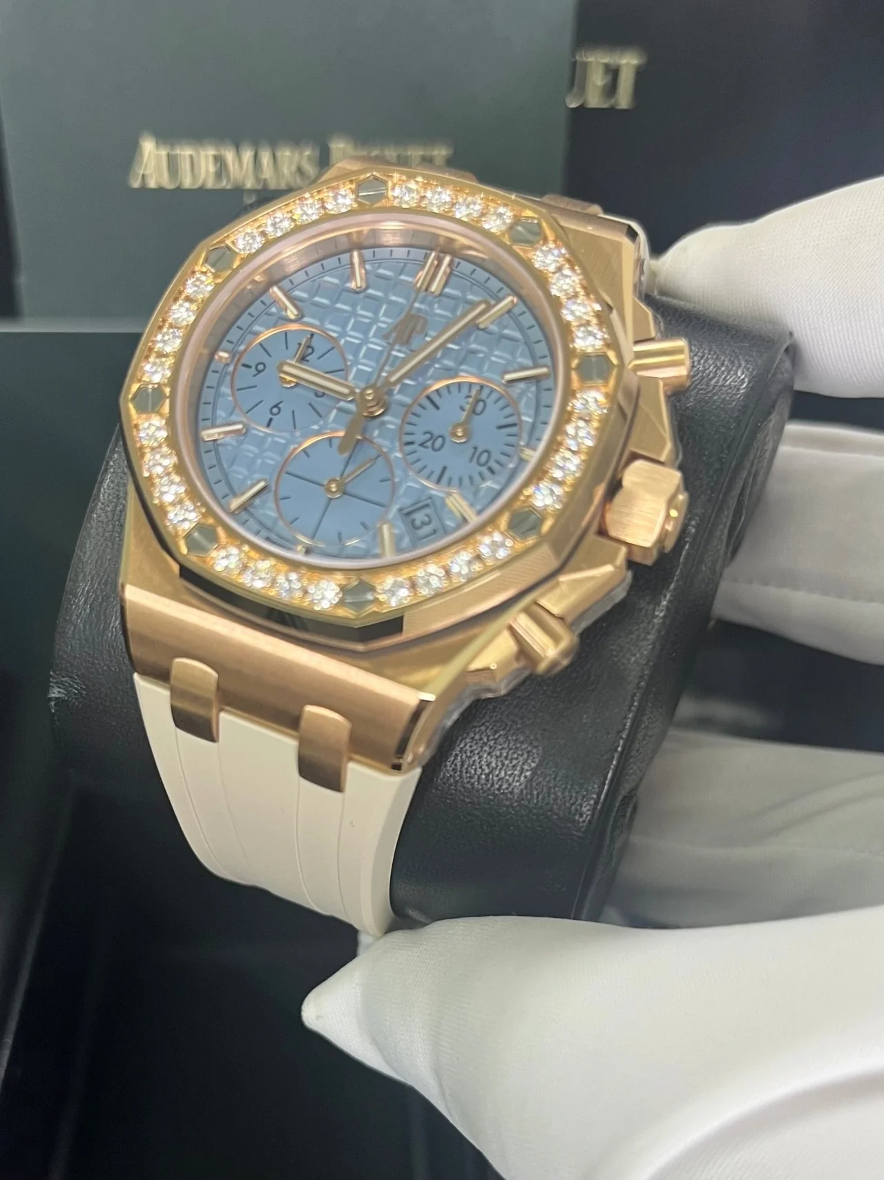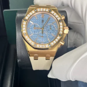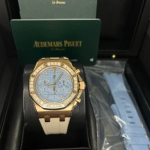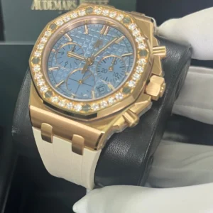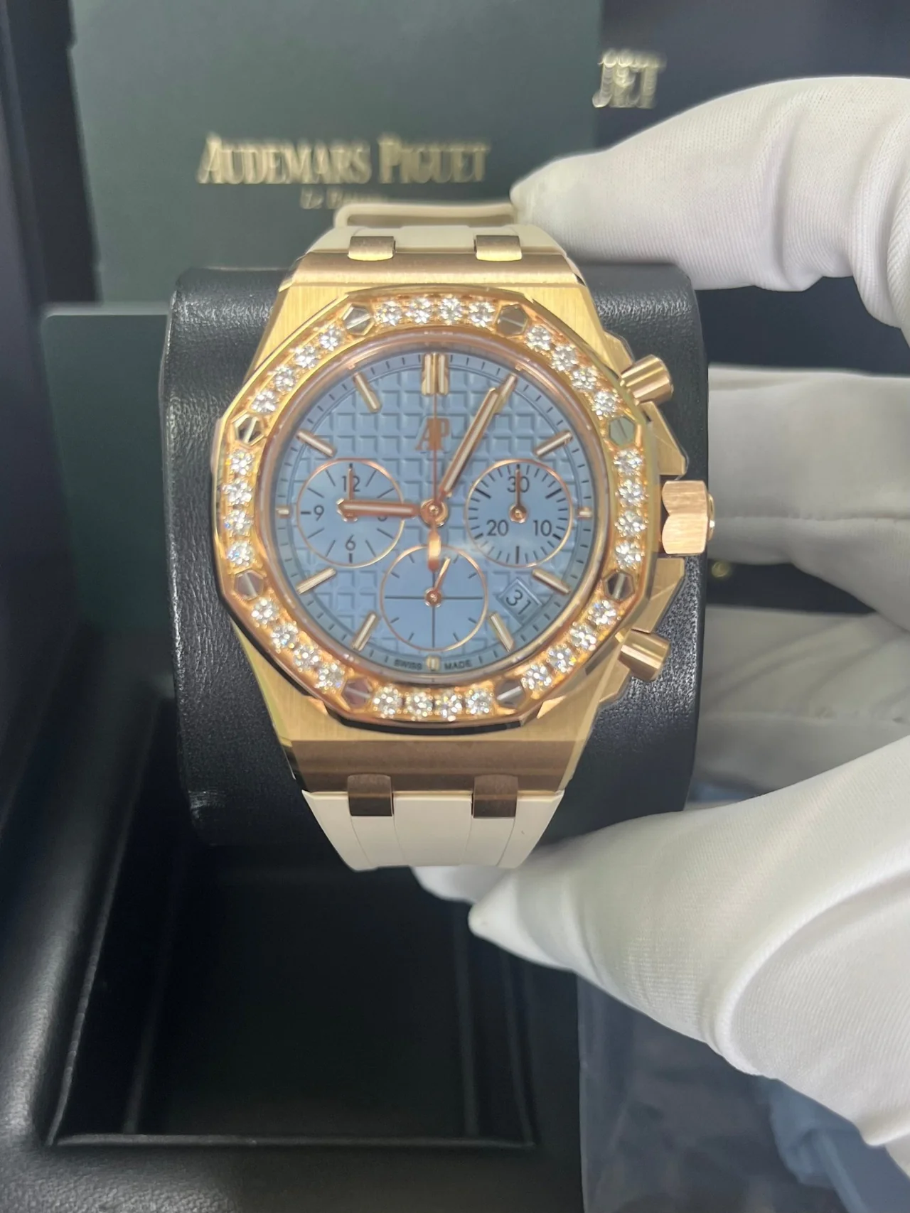 Combining a light blue “Lady Tapisserie” dial with brilliant-cut diamonds and a pink gold case, this new design brings a touch of elegance and refinement to the sporty Royal Oak Offshore Chronograph. 18-carat pink gold case, bezel set with brilliant-cut diamonds, glareproofed sapphire crystal, screw-locked crown. Light blue dial with “Lady Tapisserie” pattern, blue counters, pink gold applied hour-markers and Royal Oak hands with luminescent coating. Beige rubber strap with 18-carat pink gold pin buckle and interchangeable strap system. Additional light blue rubber strap.