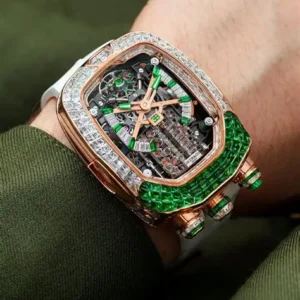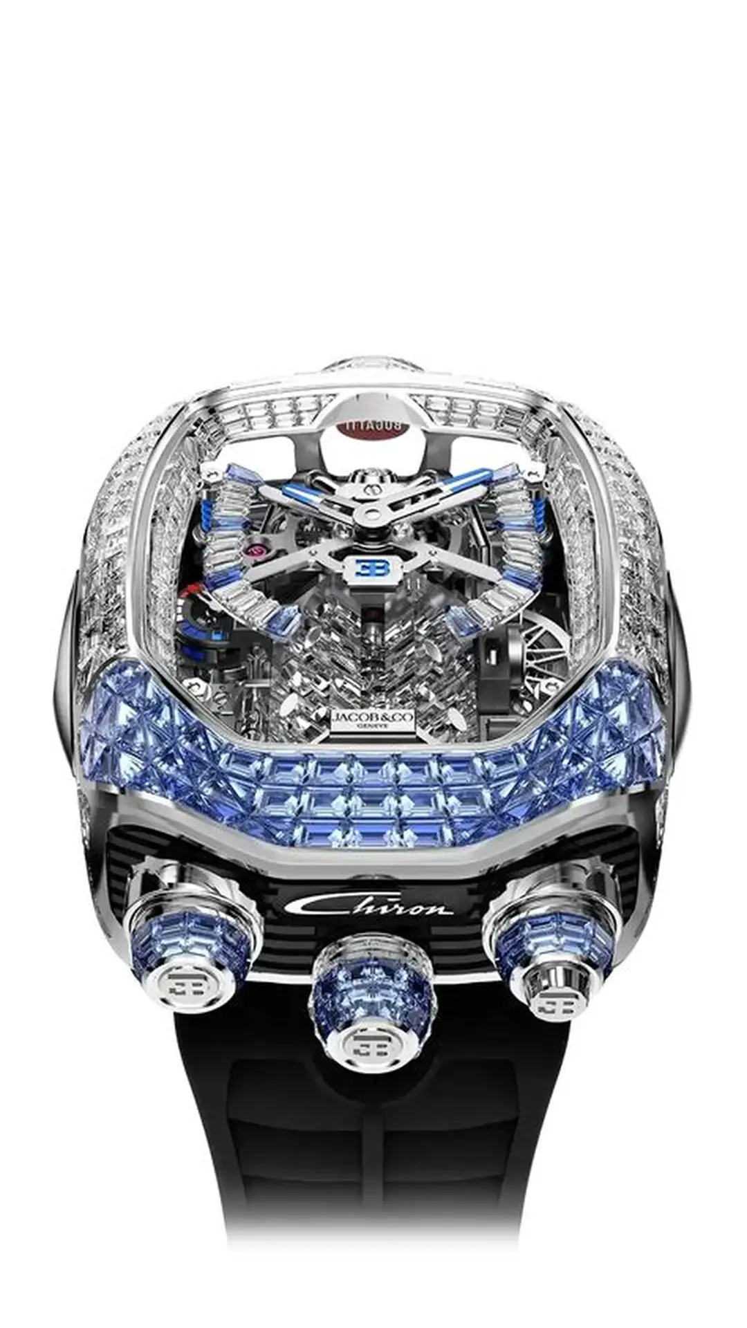 In 2019, Bugatti Automobiles and Jacob & Co. entered into a partnership agreement, based on a shared focus on extreme luxury, mechanical performance and craft. Both brands have been working together to create unrivaled hypercar-inspired timepieces.