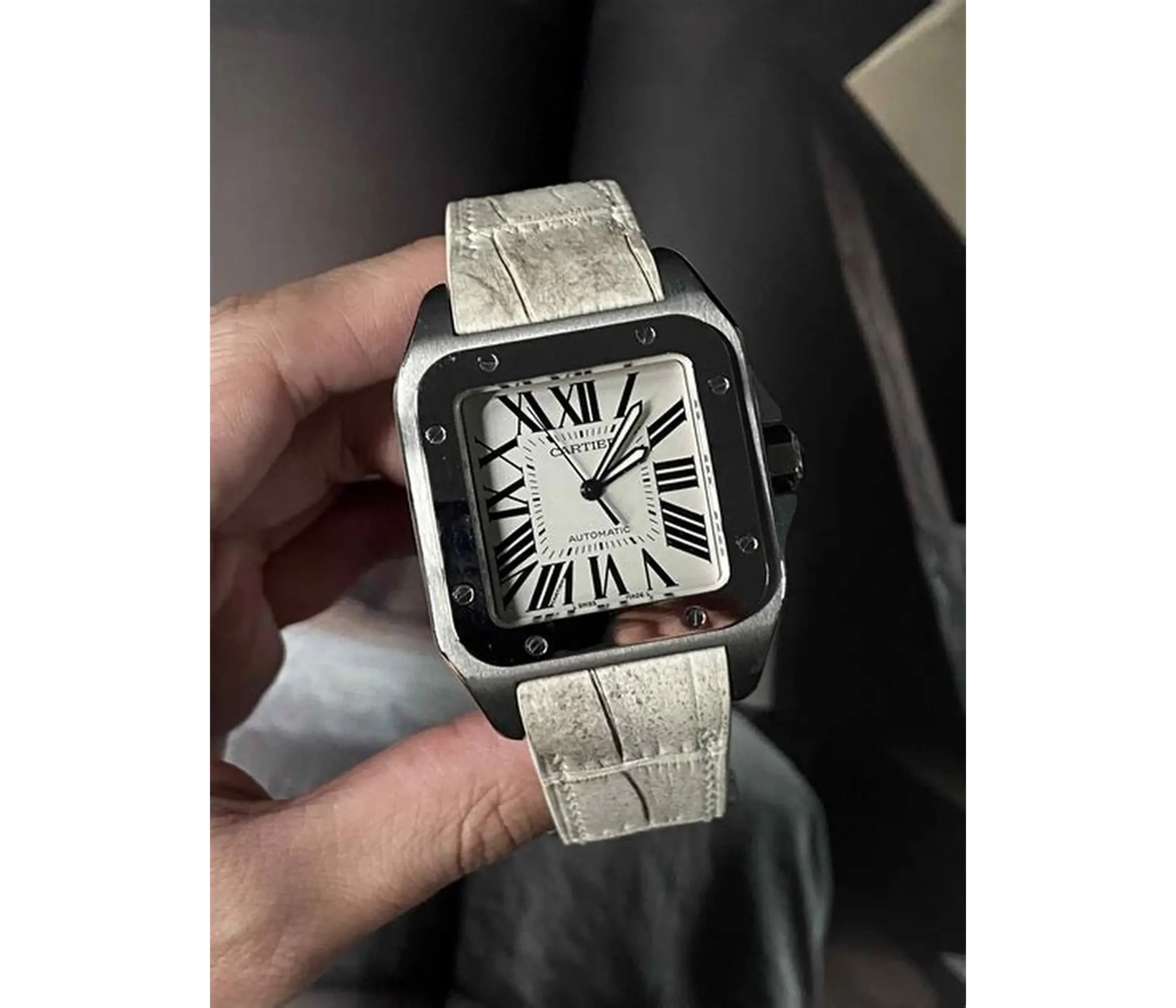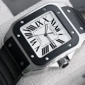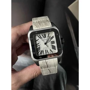 The Cartier Santos 100 Ref. 2891 in platinum is a bold reinterpretation of one of the most iconic timepieces in horological history. Crafted from precious platinum, the 42mm case elevates the watchs timeless square silhouette with a luxurious weight and finish. The crisp white dial features Cartiers signature black Roman numerals, sword-shaped blued steel hands, and a traditional railroad minute trackclassic hallmarks of the maisons design language. A sapphire cabochon crown and visible screws on the bezel further define its bold, industrial-inspired aesthetic. With its robust presence and refined detailing, the Santos 100 Platinum blends heritage, elegance, and modern masculinity into one striking statement piece.