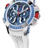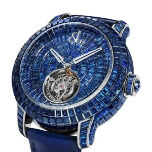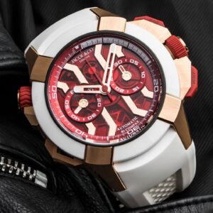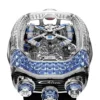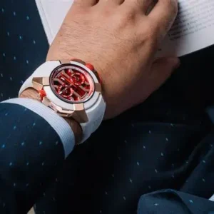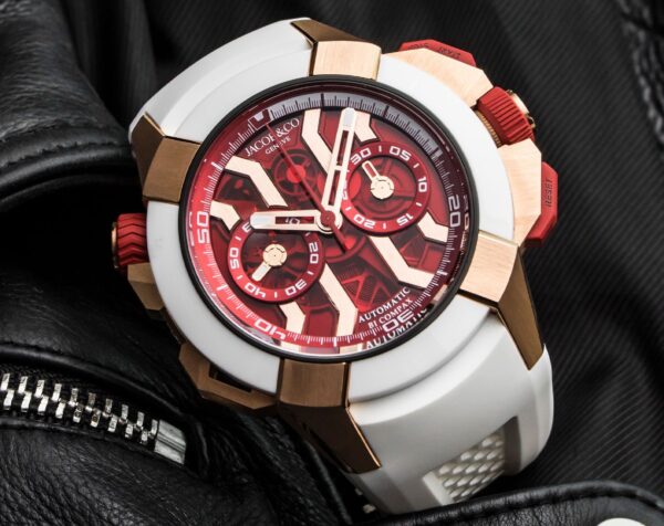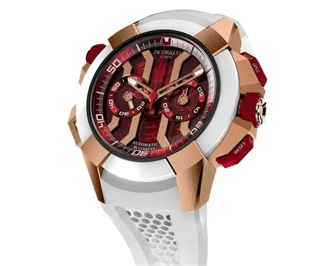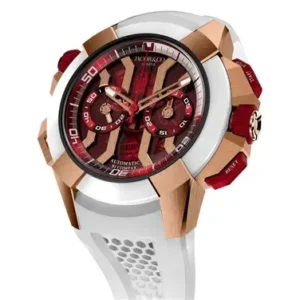 The Jacob & Co. Epic X Chrono EC313.42.SA.RR.F is a commanding expression of bold design and haute horlogerie, crafted for those who embrace performance with unmistakable flair. Encased in a substantial 47mm body of 18K rose gold, this chronograph captivates at first glance with its striking red index diala vivid contrast that underscores its dynamic spirit. The skeletonized lugs and signature X-shaped bridges reveal a sophisticated architectural aesthetic, while the ergonomic pushers and crown deliver seamless functionality. Powered by a high-precision automatic chronograph movement, the Epic X Chrono offers a compelling fusion of technical mastery and avant-garde styling, reflecting Jacob & Co.s relentless pursuit of innovation in luxury watchmaking.