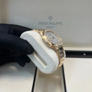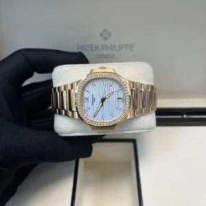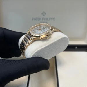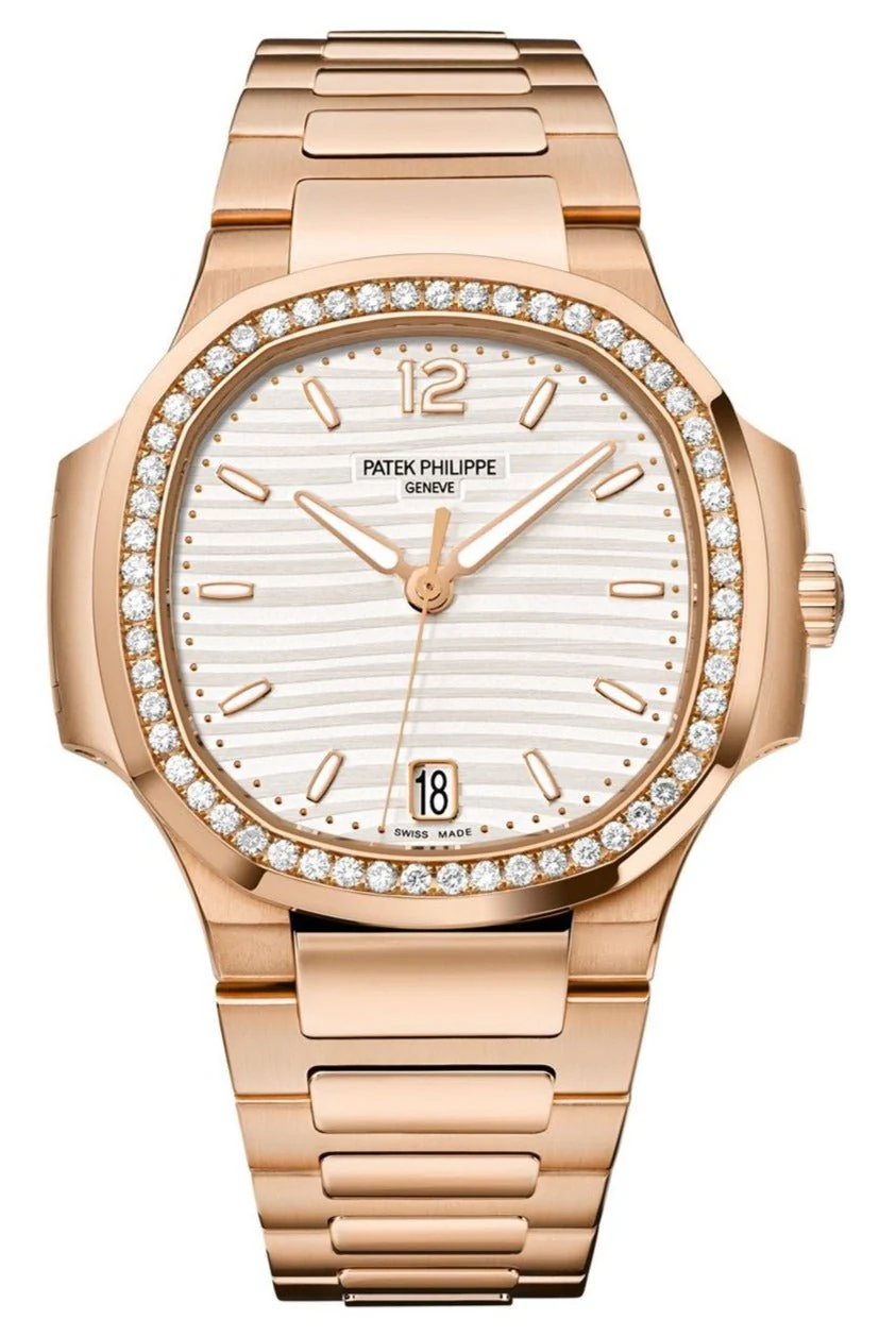 35.2 mm 18K rose gold case, sapphire-crystal back, bezel set with 56 diamonds (~ 0.67 ct), silvery opaline dial with gold applied hour markers and numerals with luminescent coating, caliber 324 S C self-winding movement with date in an aperture and center sweep second hand, approximately 35-45 hours of power reserve, 18K rose gold bracelet, fold-over buckle. Water resistant to 60 m.