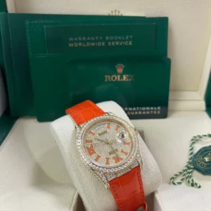This 2024 Rolex Day-Date 36 128158RBR has a unique Yellow Gold/Diamond configuration on a striking coral leather strap. The 36 mm round case has the classic Screw Down Crown and is fully encrusted with internally flawless Rolex factory diamonds. The Diamond Pave Dial features 450 diamonds and matching coral enamel index hour markers and Roman numeral markers at VI and IX. The certified Swiss-tested Rolex Automatic Movement will keep you in perfect time, and the elegantly designed Rolex leather will look great and feel comfortable on your wrist. |