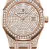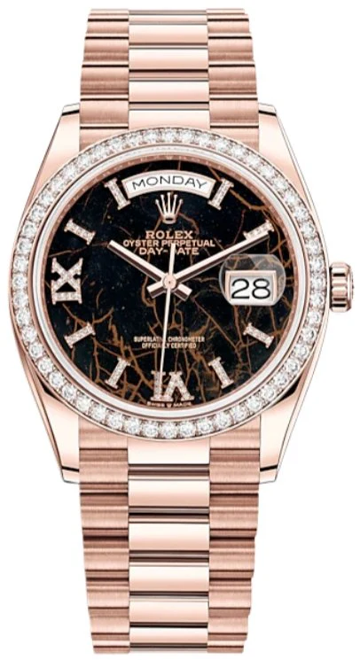 Inlaid in a sophisticated 36mm 18k rose gold case surrounding an eisenkiesel designed dial with hour markers in 18 ct gold set with 32 diamonds, Roman VI and IX in 18 ct gold set with 24 diamonds. The bezel is exquisitely set with diamonds. The dial is protected by a scratch-resistant sapphire-crystal and is powered by the Caliber 3255 Perpetual movement complete by a power reserve of 70 hours. The Day-Date also utilizes a process that involves screwing the case back, bezel, and Twinlock screw-down crown into the Monobloc middle case for waterproofness up to 100 meters. The symbolic 18k rose gold presidential bracelet includes semi-circular three-piece links and concealed Crownclasp, being the most sought-out timepiece to date. Its functions include Centre hour, minute and seconds hands Instantaneous day and date in apertures, unrestricted rapid-setting and stop-seconds for precise time setting.
