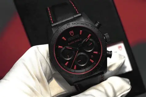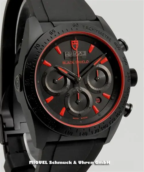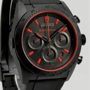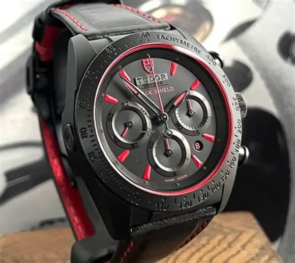 The Tudor Fastrider Black Shield 42000CR is a bold and aggressive chronograph built for high performance and modern style. Housed in a 44mm monobloc black ceramic case, this timepiece is completely matte finished for a stealthy, scratch-resistant look. The black dial is accented with striking red details—including the hands, markers, and chronograph registers—evoking a strong racing aesthetic inspired by Ducati motorcycles. Powered by a self-winding mechanical movement with a 46-hour power reserve, the Fastrider Black Shield also features a tachymeter bezel, screw-down pushers, and 150 meters of water resistance, delivering both rugged durability and technical precision.